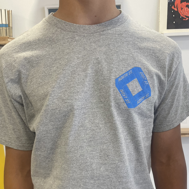 Grey t-shirt, blue print. X-large